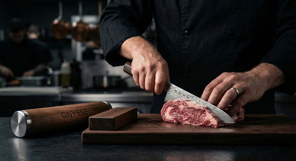 The Onysse Rolling Sharpener combines an industrial diamond-coated disc with a precision magnetic guide. This ensures your blade maintains a constant, perfect angle with every stroke. Simply lock your knife in place, roll to sharpen, and restore a razor-edge in seconds—no experience required.