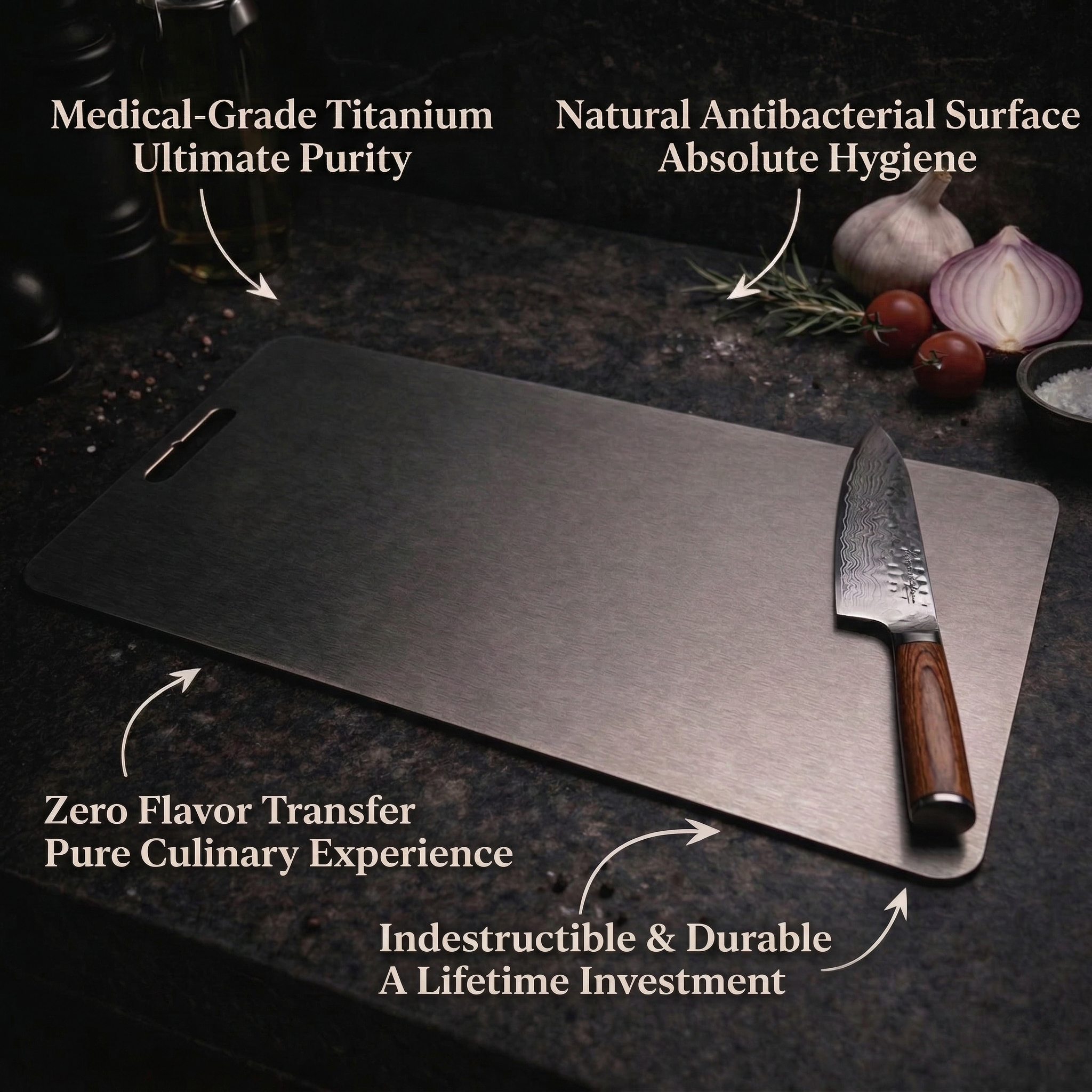 Titanium’s non-porous surface repels bacteria and stains. The ultimate hygienic foundation for your Damascus blades